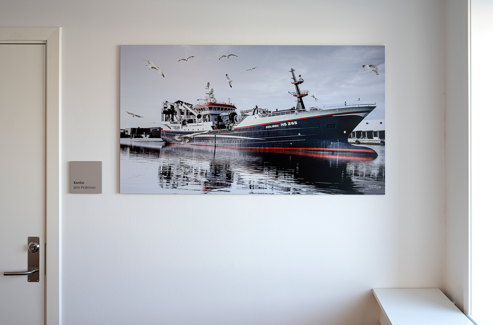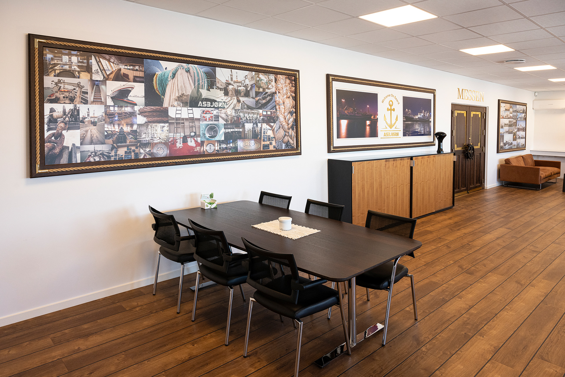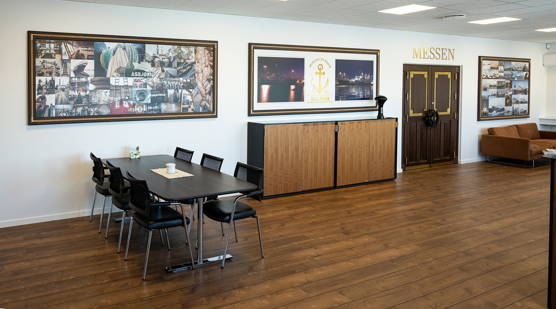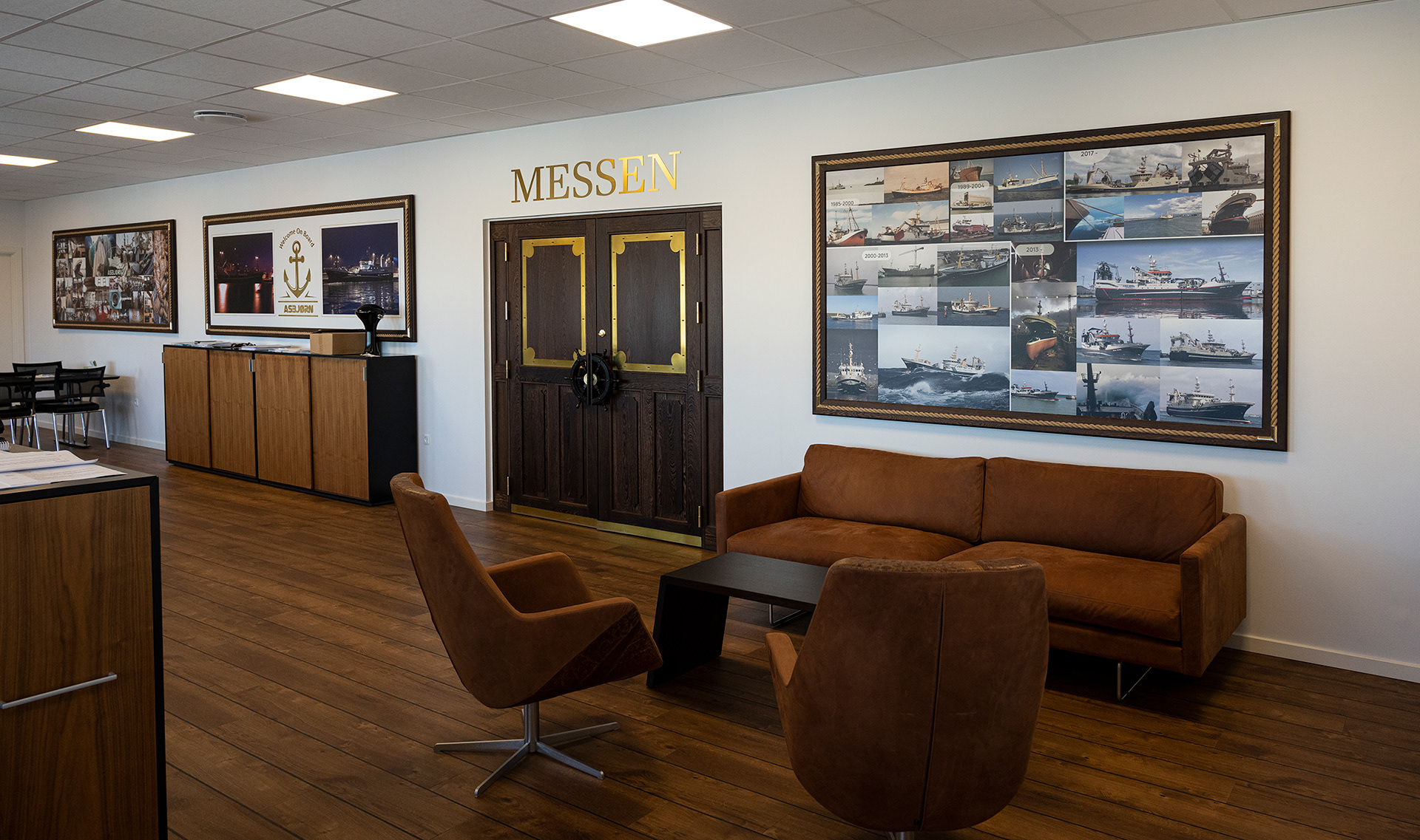 Hos Asbjørn A/S havde de fået nyt domicil og manglede lige det sidste (billederne på væggene) og et par møbler. Møblerne er med fiskeskind og en helt særlig udgave, som jeg anbefalede fra Søren Lund Møbler.