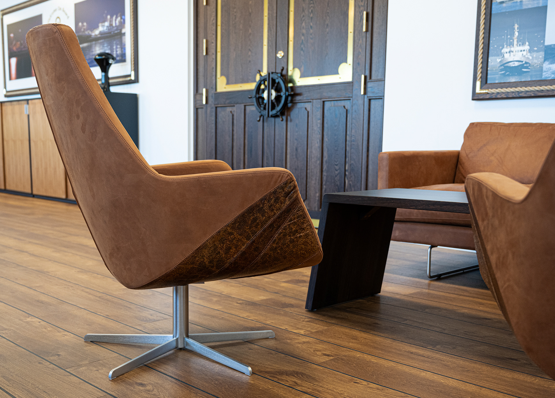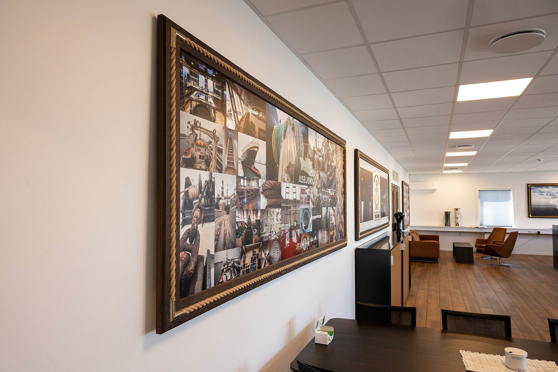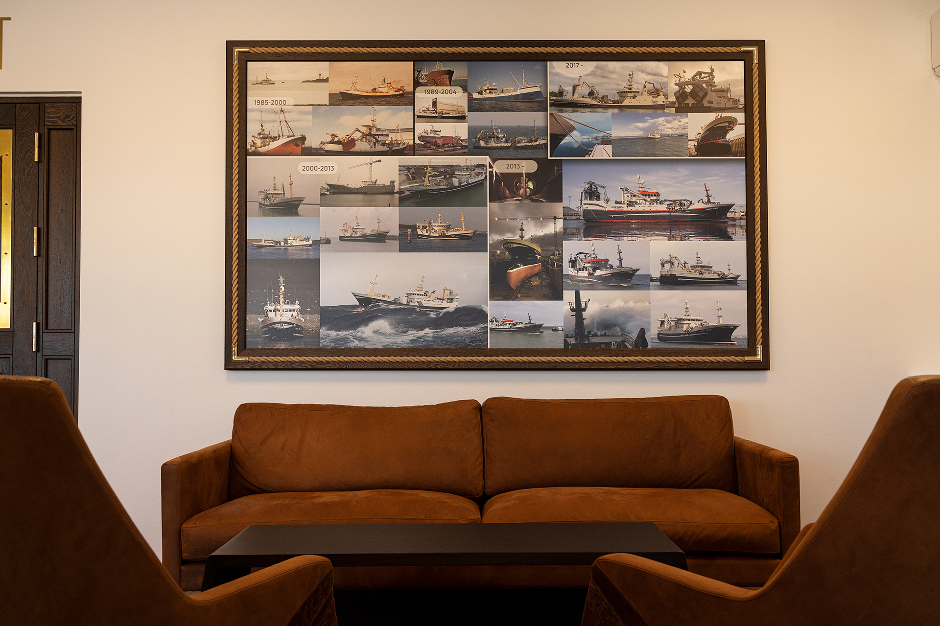 Hos Asbjørn A/S havde de fået nyt domicil og manglede lige det sidste (billederne på væggene) og et par møbler. Møblerne er med fiskeskind og en helt særlig udgave, som jeg anbefalede fra Søren Lund Møbler.