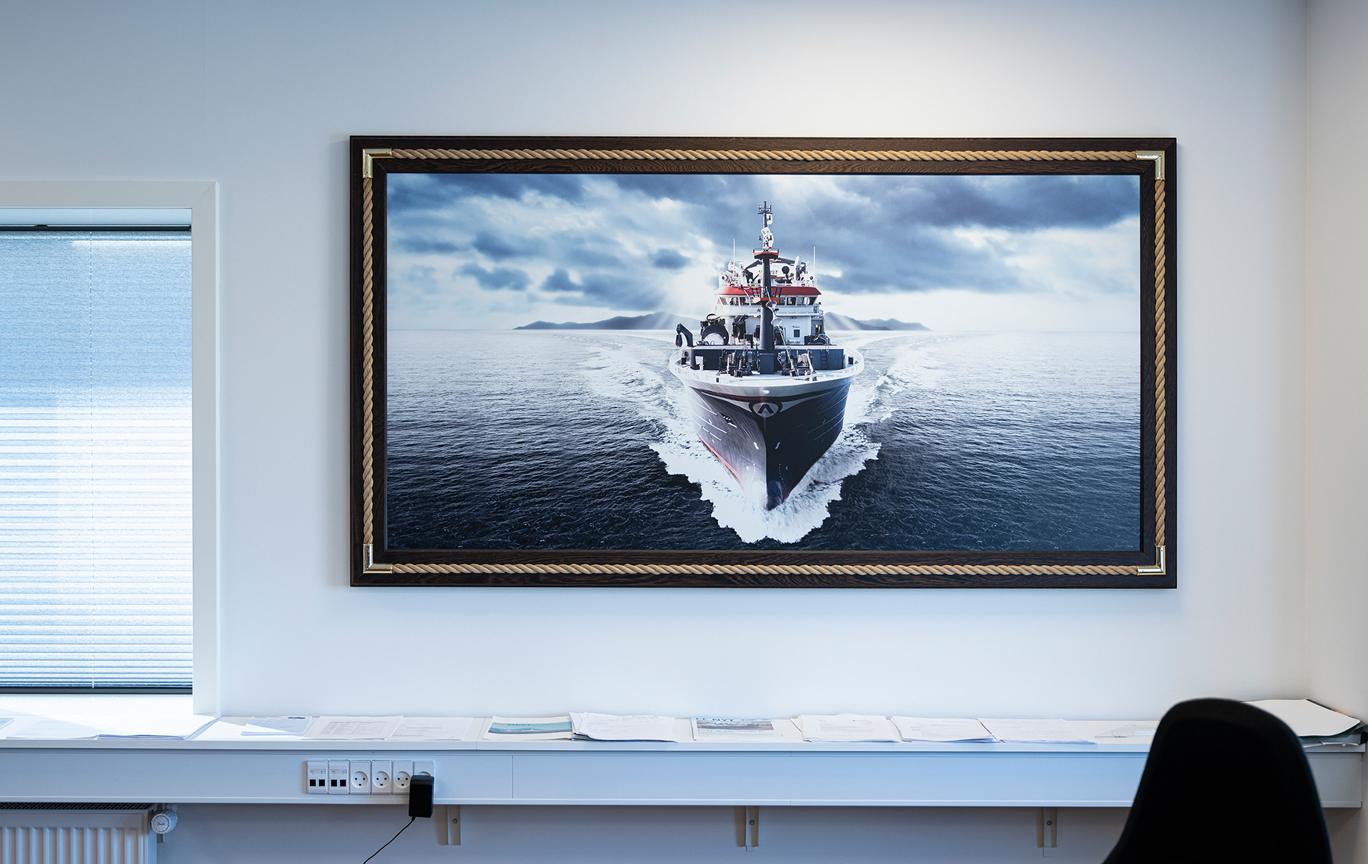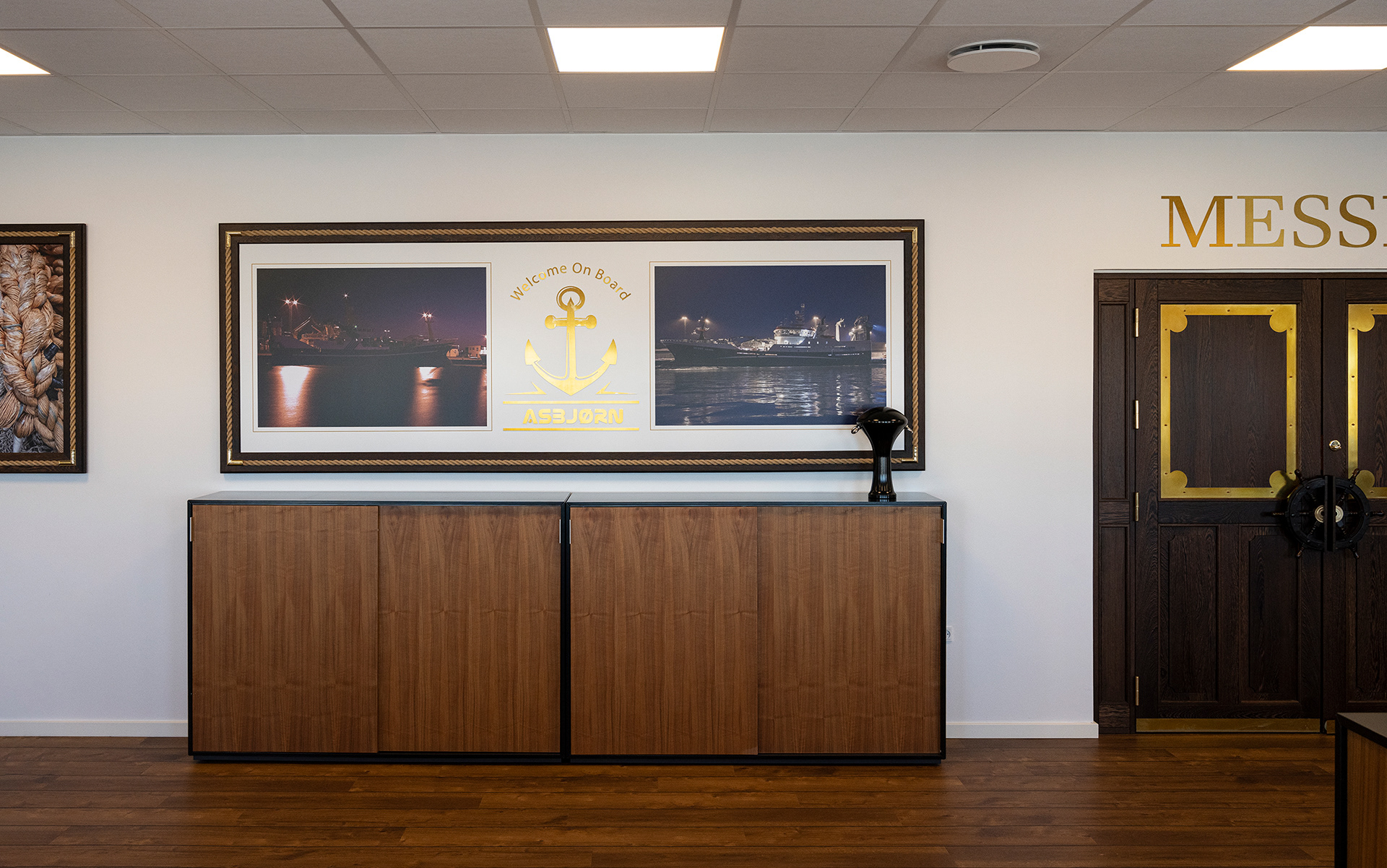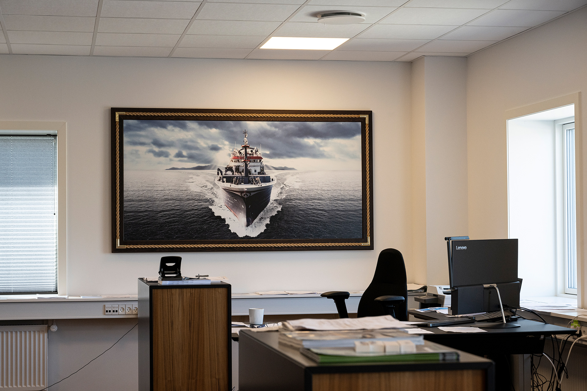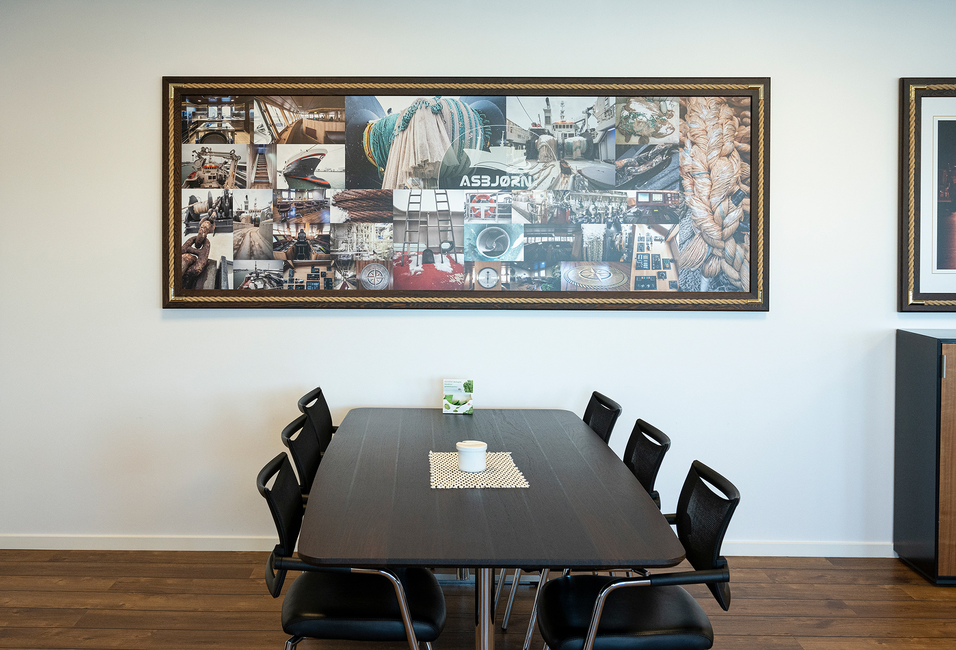 Hos Asbjørn A/S havde de fået nyt domicil og manglede lige det sidste (billederne på væggene) og et par møbler. Møblerne er med fiskeskind og en helt særlig udgave, som jeg anbefalede fra Søren Lund Møbler.